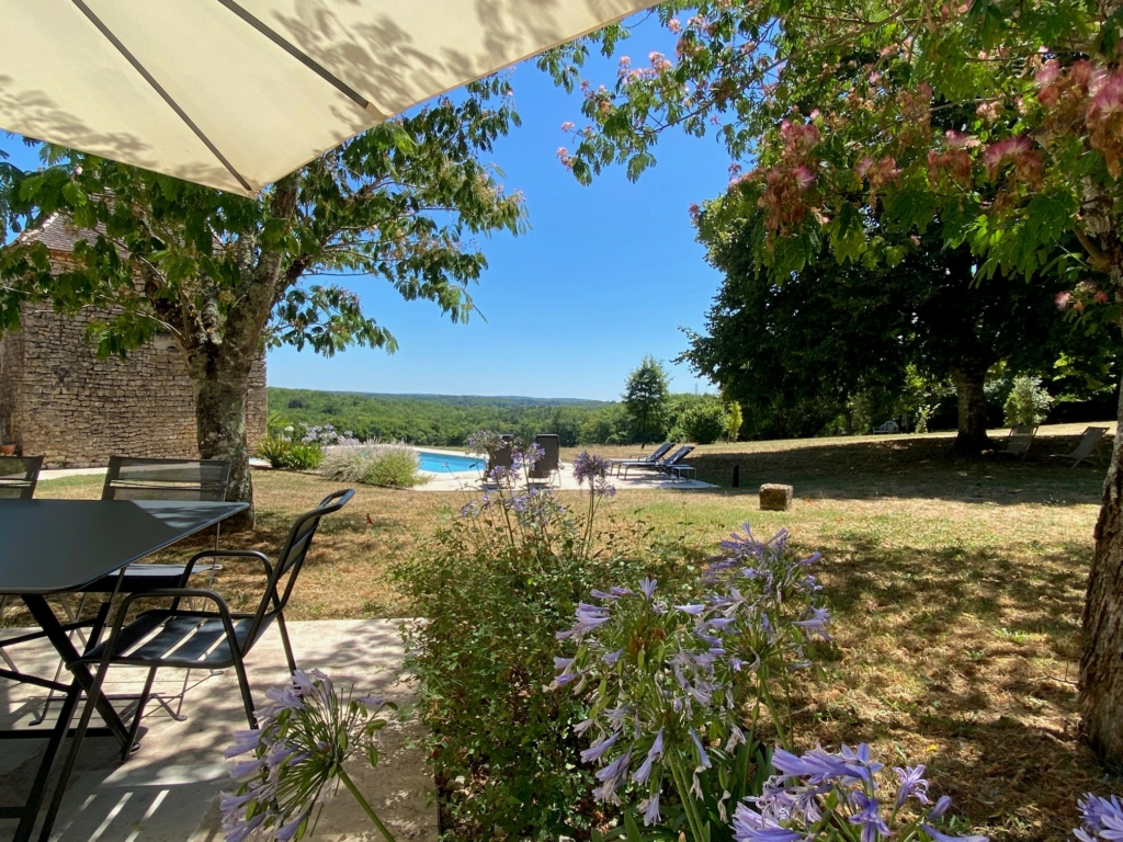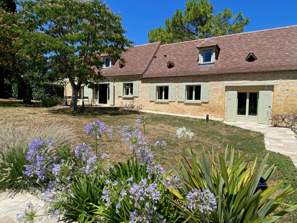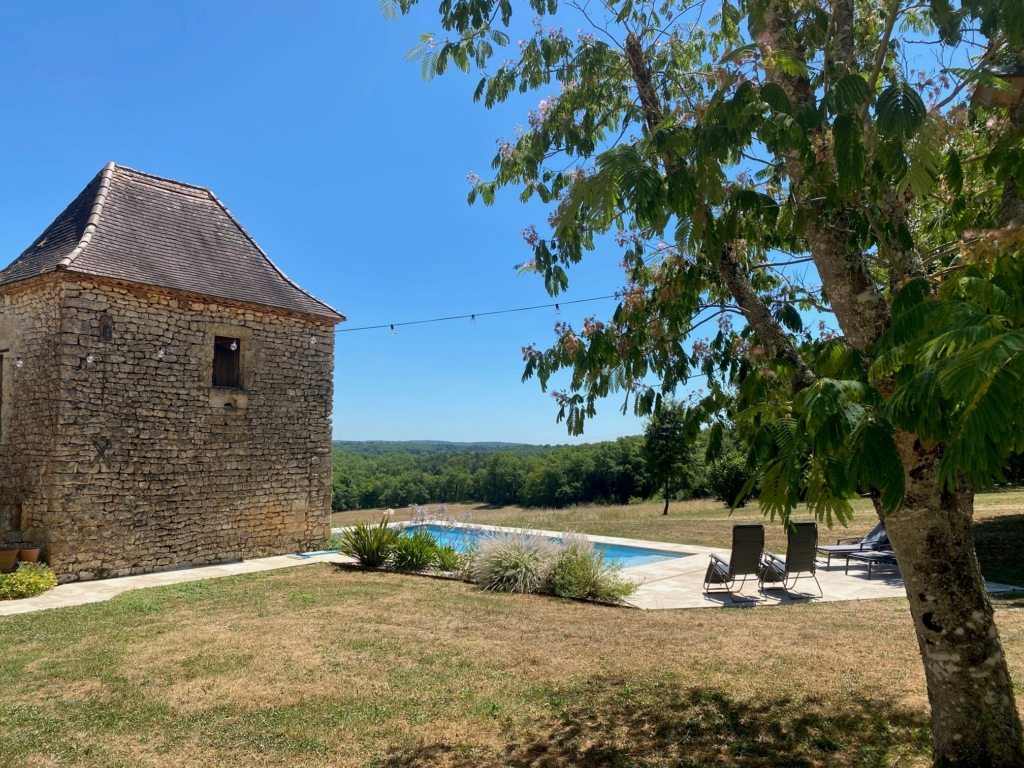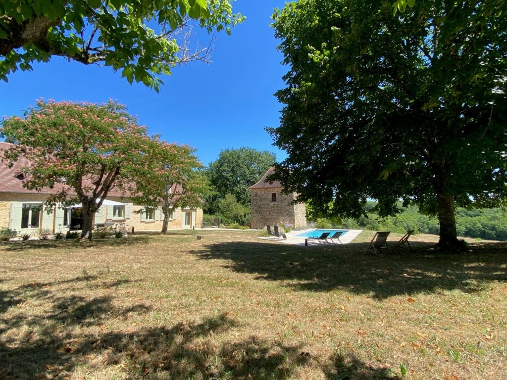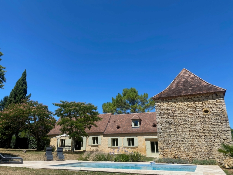 Une maison périgourdine avec piscine, 4 hectares, 5 chambres, 8 couchages (+2 d’appoint), située à Lalinde en Dordogne. La chartreuse en pierre est composée de deux plateaux de 90m².